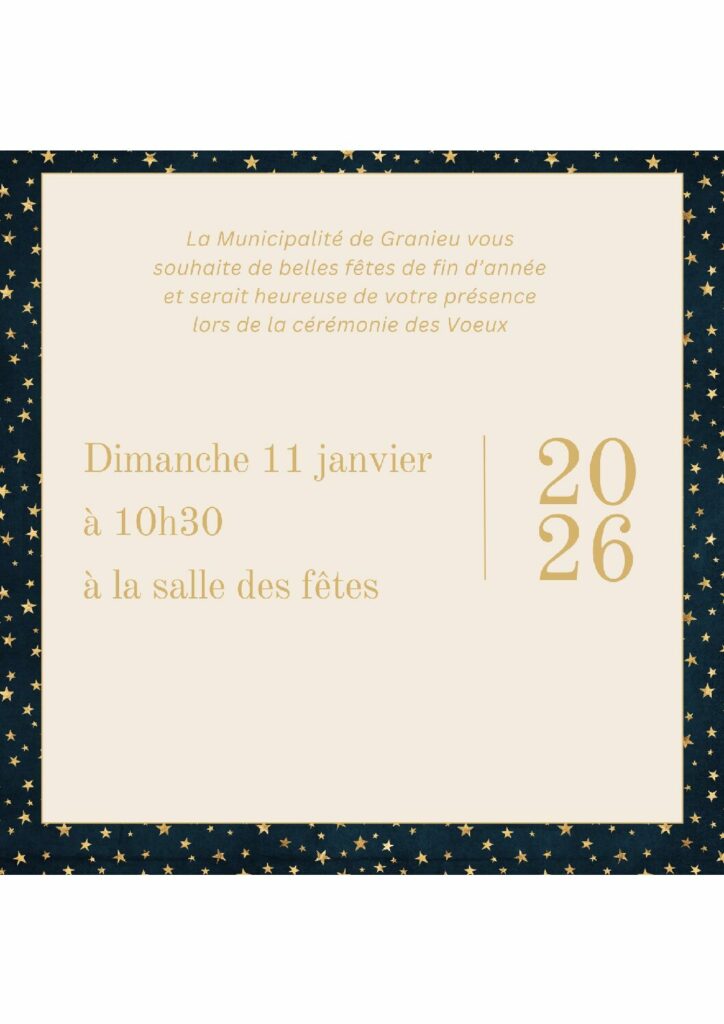 Voeux à la PopulationActualitésil y a 1 semaineLa Municipalité vous invite à venir prendre le verre de l’amitié à l’occasion de la traditionnelle cérémonie des Voeux.