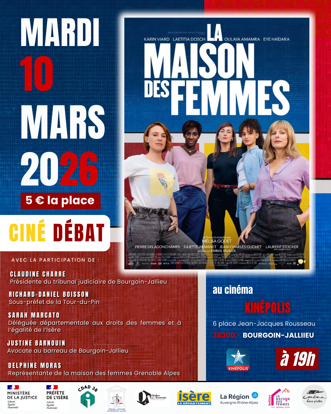 À l’occasion de la Journée des femmes (08 mars), le conseil départemental de l’accès au droit de l’Isère organise un ciné-débat autour du film « La Maison des Femmes » de Mélissa GODET, au cinéma Kinépolis de Bourgoin-Jallieu, le mardi 10 mars 2026 à 19h00.